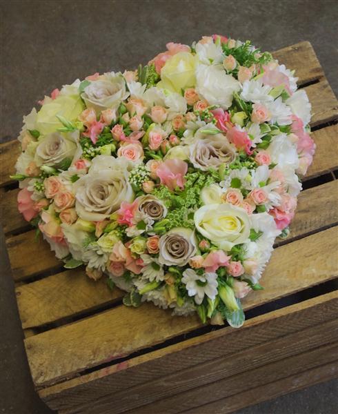 This Delicate arrangement of pretty pastel roses with spray roses and other seasonal blooms is a beautiful tribute for any loved one, available in all rose colours, please call to enquire on a particular colour preference.
