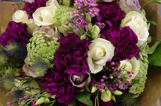 A beautifully sumptuous bouquet of vintage styled roses with rich tones and dusty hues. Hand tied and presented in our signature wrap.