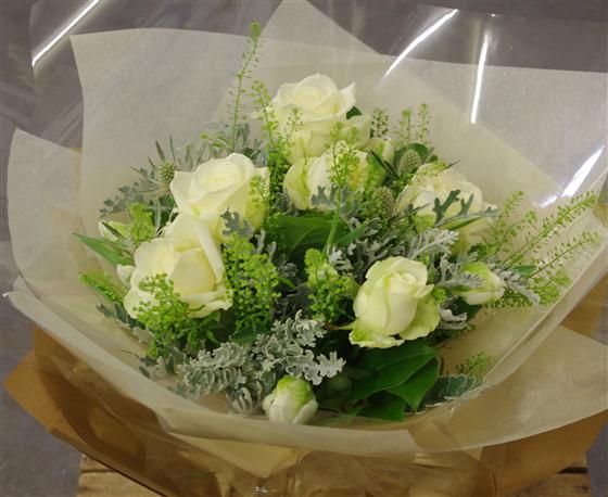 A stylish bouquet of all white blooms, including roses intermingled with silver and Christmas foliage.
